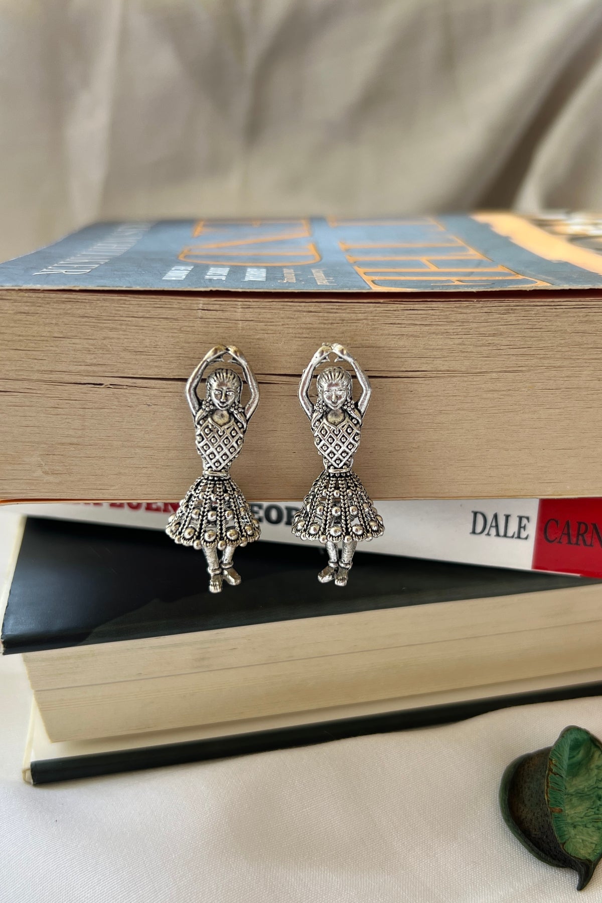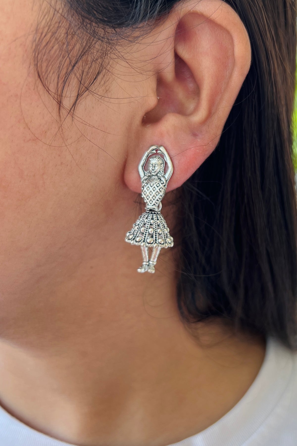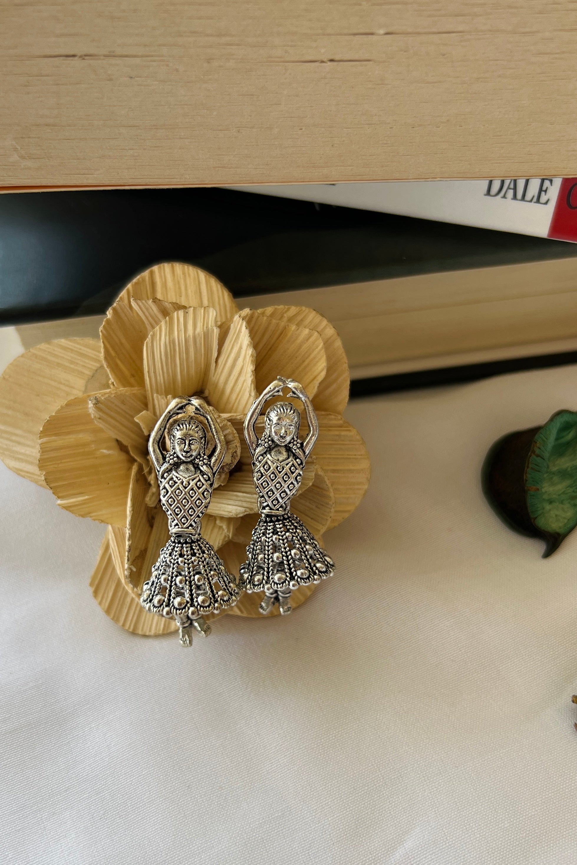 Design: Handcrafted in oxidised silver, the earrings depict a dancer mid-twirl — her form alive with motion and grace. Every swirl, fold, and contour is sculpted with intricate detail, echoing the mastery of traditional craftsmanship. The oxidised finish adds a touch of vintage allure, making these earrings a wearable piece of art.