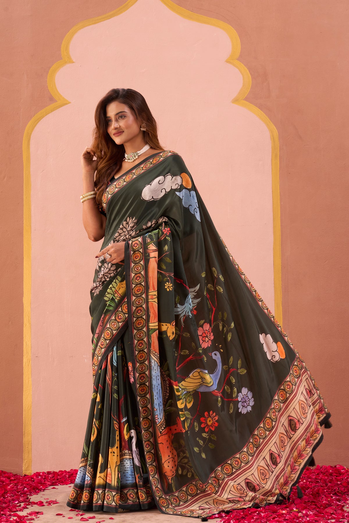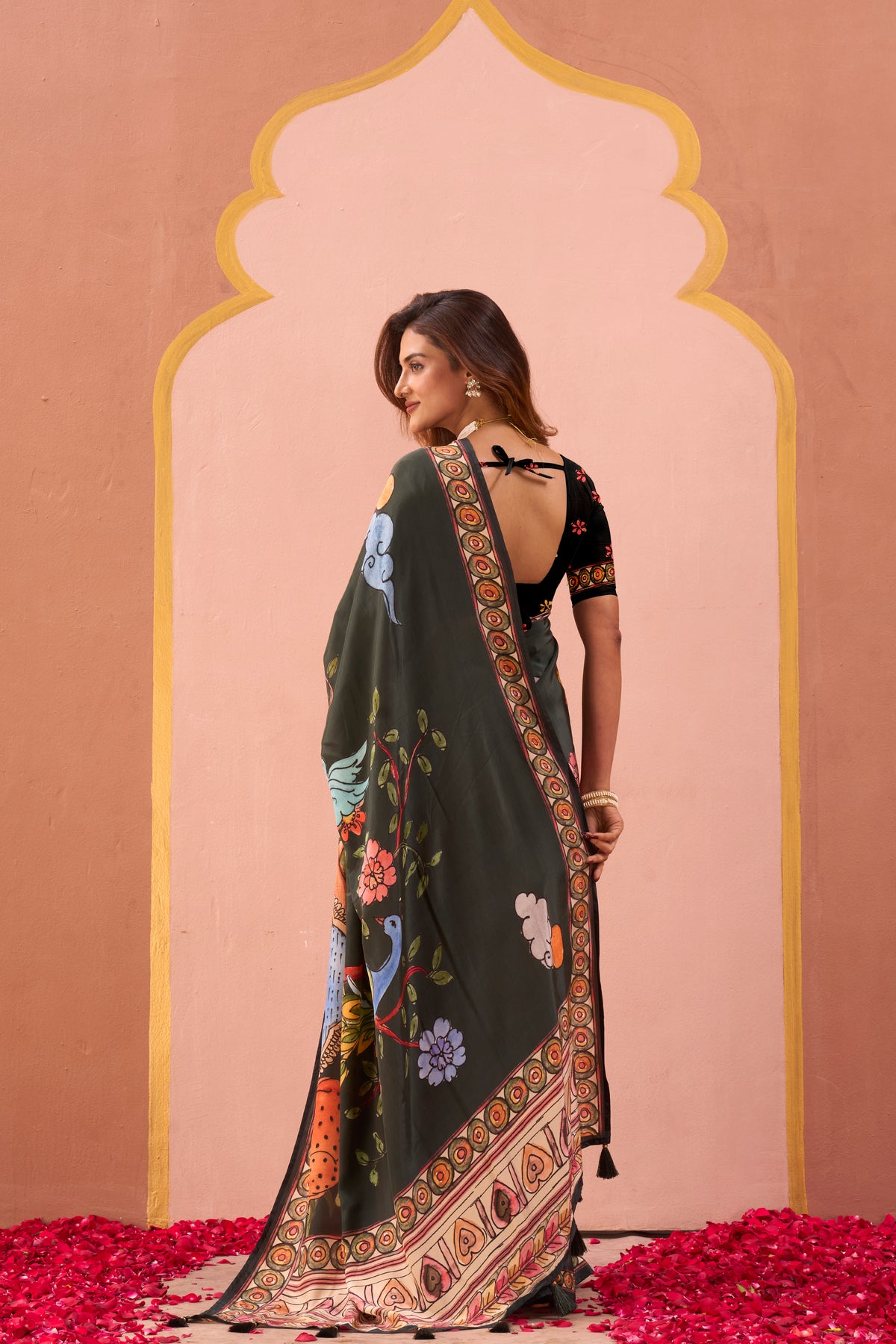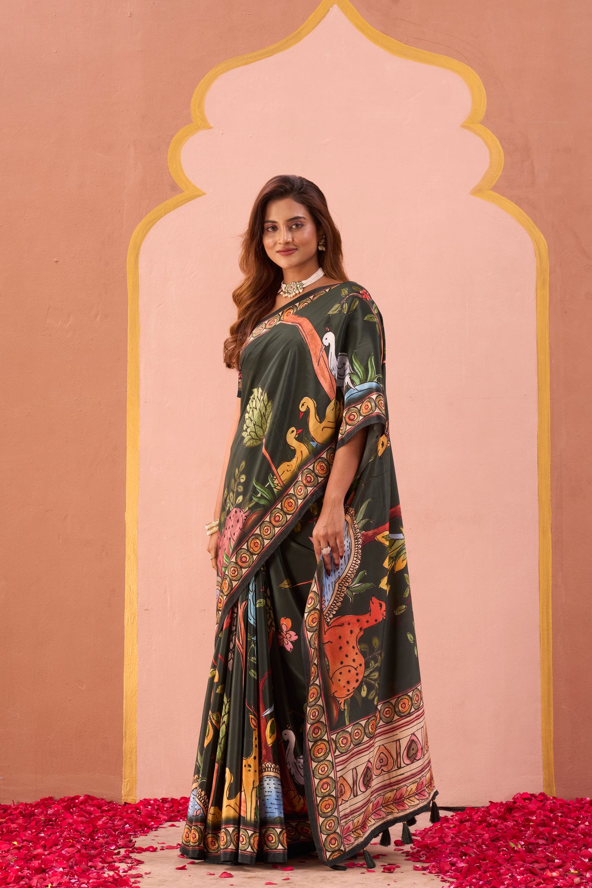 This deep green saree is a true canvas of nature, featuring striking hand-drawn animal and botanical motifs that bring the wilderness to life. Framed with an intricately patterned border and tasselled edges, it blends traditional folk art with a bold, contemporary aesthetic. Perfect for statement-making occasions, this saree celebrates the beauty of nature through vibrant storytelling.