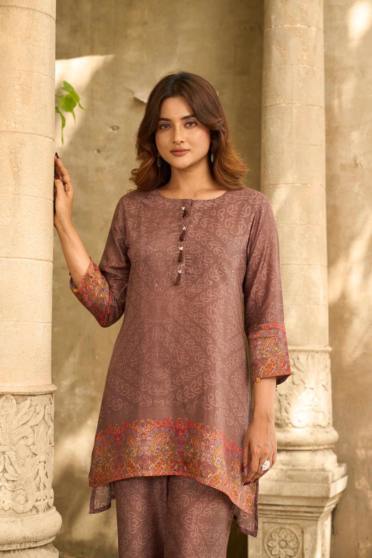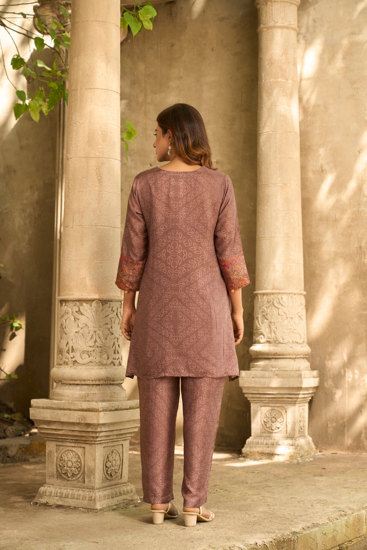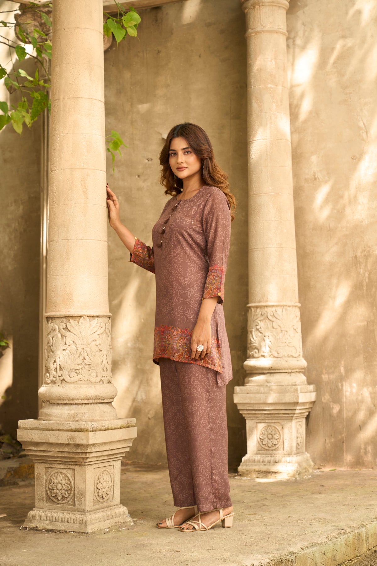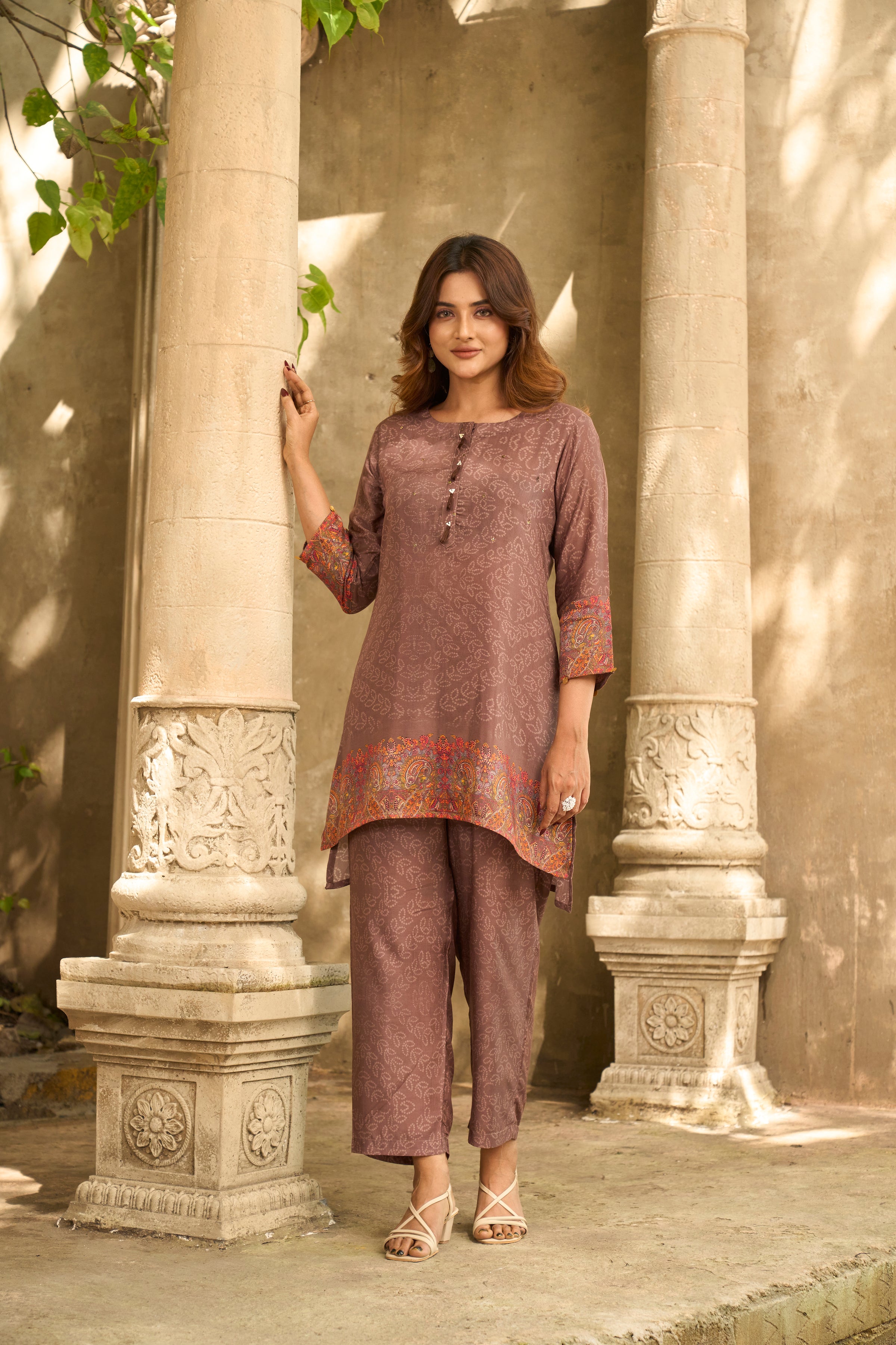 A graceful pure fine silk co-ord set in earthy tones with subtle self-print patterns. The kurta features a round neckline with fabric buttons and printed borders on the sleeves and hemline, adding a refined touch. Paired with matching straight pants, this outfit is perfect for a polished yet comfortable look.